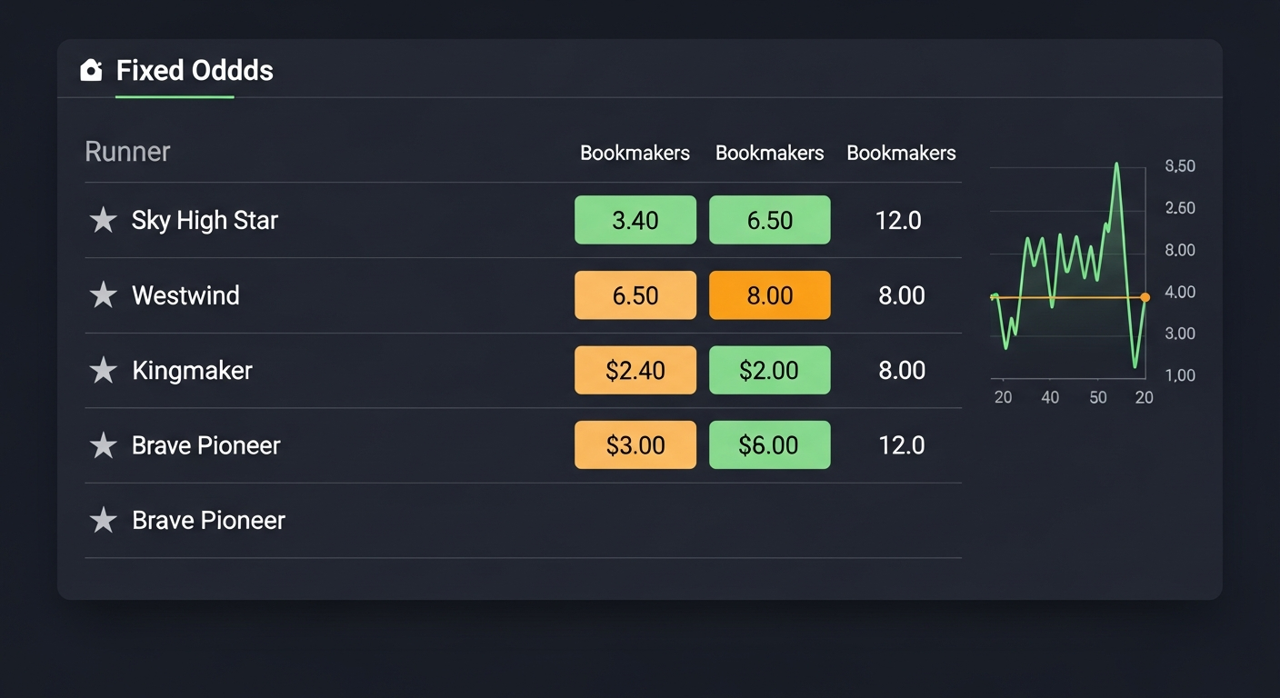 OddsHistory tracks every published fixed-odds price across Australian thoroughbred, harness and greyhound racing. Watch the win and place market move in real time, jump back to any minute in the last 30 days, and see at a glance which bookmaker is out of step with the rest of the market.